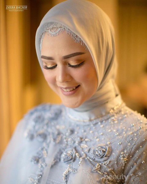 Wanita yang akrab disapa Chika ini terlihat sangat cantik nan anggun di hari pertunangannya. Wanita yang kini mantap untuk berhijab itu tampil memukau dengan dress bewarna biru lembut dengan model duyung.