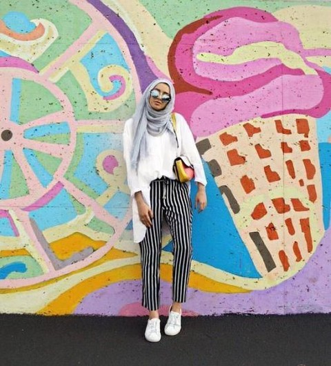 Warna hijab abu-abu termasuk dalam warna dasar sehingga kamu perlu memadukannya dengan atasan yang memiliki motif. Kamu bisa menggunakan kaus dengan tulisan-tulisan lucu atau menggunakan outerwear yang motifnya penuh dari atas hingga bawah.