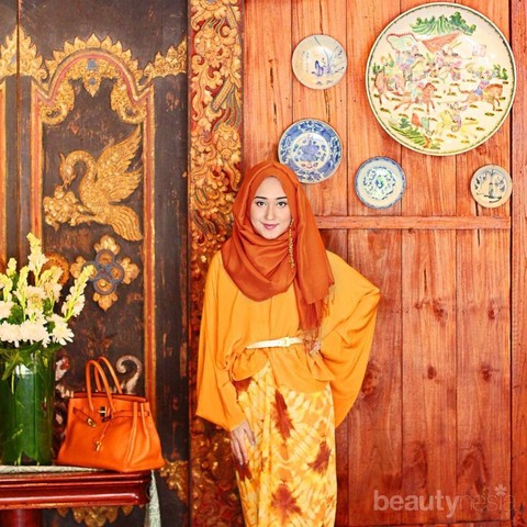 Jika kamu masih tetap ingin bermain aman dengan pemilihan warna-warna senada, kamu bisa memadukan pashmina terracotta dengan setelan kebaya dengan warna dasar jingga sebagai hijabers style kamu. Terracotta-nya akan tetap serasi dengan motif pada kain dan tas yang kamu tenteng.