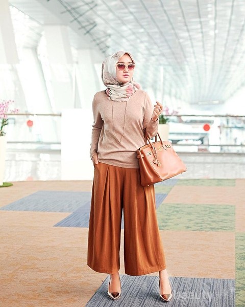 Ingin hangout bersama teman atau sekedar menghabiskan waktu sore bersama keluarga? Kamu patut coba gaya santai yang satu ini. Paduan atasan berbahan kaos warna cream sangat serasi dengan bawahan kulot longgar warna terracotta. Sempurnakan penampilanmu dengan jilbab segiempat motif dan tas wanita berwarna senada. Gaya ini sangat cocok dipakai oleh para hijabers cantik Indonesia.