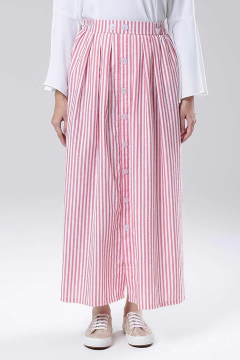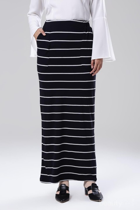 Model rok pertama yang populer digunakan oleh para remaja untuk style hijab casual yang simpel adalah skinny skirt dengan motif stripes. Rok yang memiliki potongan fit body ini memang cocok banget untuk kamu yang ingin terlihat lebih tinggi. Akan tetapi, untuk menghindari kesan kurus, motif garis horizontal sangat membantu kamu untuk tampak lebih ideal. Dijamin tampilan kamu akan semakin modis dengan gaya minimalis!