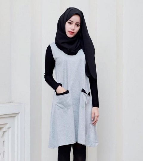 Look terakhir dari Aghnia Punjabi adalah tampilan girly dan feminin dengan menggunakan tunic dress bernuansa monokrom. Aghnia terlihat memadukan tunic dress-nya yang berwarna abu-abu dengan kaos dan celana jeans hitam. Hijab berwarna hitam yang dikenakan Aghnia juga semakin mempertegas gaya monokromnya. Tapi berbeda dengan gaya monokrom Aghnia sebelumnya, kali ini Aghnia terlihat lebih manis dan feminin dengan tunic dress selutut yang ia kenakan.