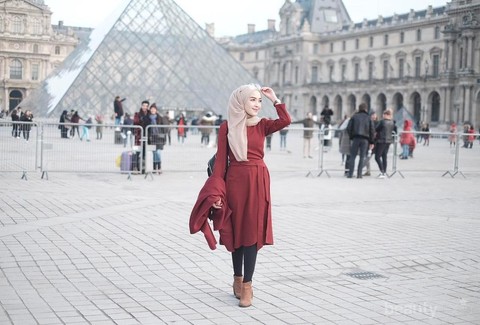 Saat berlibur ke Eropa, Hamidah menggunakan padu padan tunik warna merah legging hitam dan hijab dusty pink. Pilihan outfit ini cantik banget untuk kamu coba dalam tampilan fashion hijab casual yang elegan dan manis.