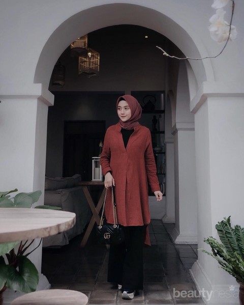 Perpaduan warna dusty pink pada hijab dan celana kulot yang digunakan Dwi ini terlihat stylish saat bersanding dengan blouse merah. Ia pun menggunakan kalung tassel yang simpel untuk tampilan yang lebih berdetail.