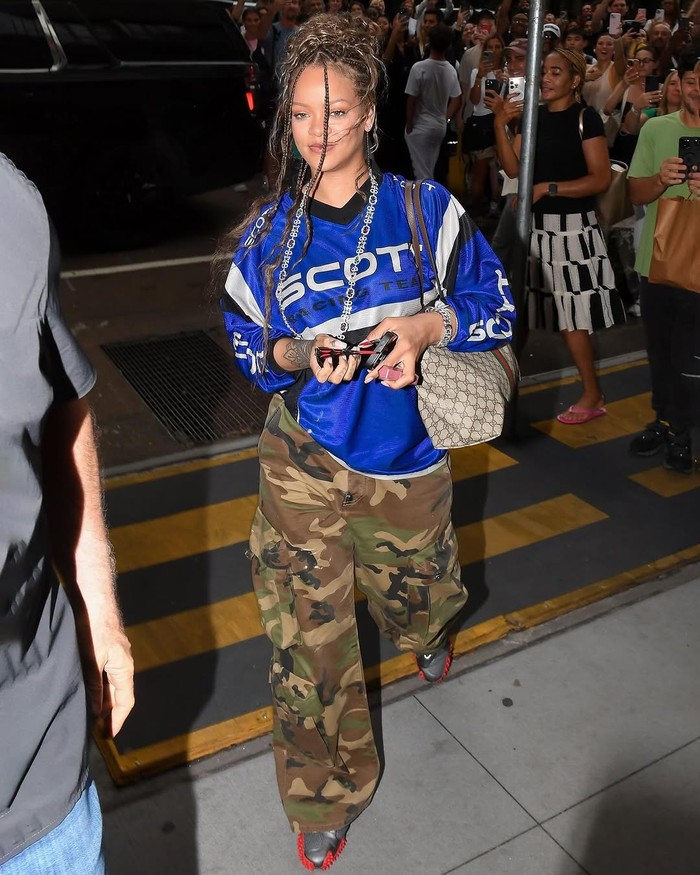 Rihanna, yang dikenal sebagai ikon mode dan pendiri Fenty, tampil dengan gaya blokette yang semakin populer di TikTok. Ia mengenakan jersey longgar berwarna biru dari Scott Racing Team yang dipadukan dengan celana cargo motif camo.