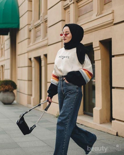 Foto: https://id.pinterest.comSweater adalah salah satu fashion items yang tepat untuk dipadupadankan dengan celana jeans. Supaya merasa lebih nyaman, hijabers bisa memilih oversize sweater. Selain terlihat fashionable, penampilan kamu juga terlihat tetap sopan meski memakai celana jeans.