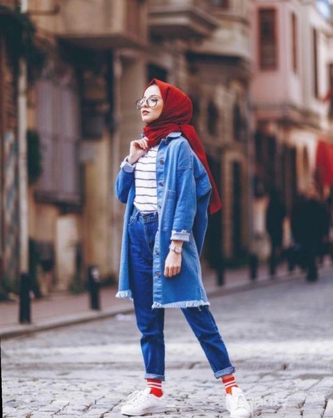 Foto: https://id.pinterest.comUntuk hijabers, denim on denim style bisa diaplikasikan dengan gaya yang berbeda, lho. Misalnya dengan mengenakan long denim shirt sebagai outer dan stripe t-shirt sebagai dalaman. Kamu juga bisa memilih pashmina berwarna merah untuk mengombinasikan warna supaya lebih cerah. Terakhir, jangan lupa pakai sneakers juga untuk mempermanis penampilan.