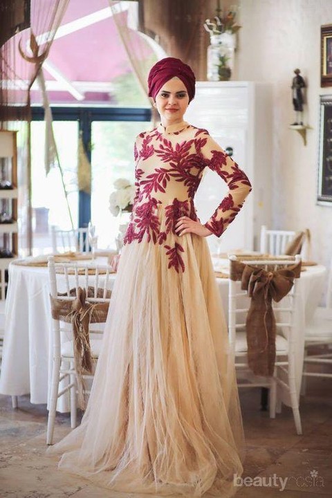 Terakhir, untuk tampilan pesta yang lebih elegan, perpaduan gaun atau dress dengan style hijab modern turban dapat menjadi pilihan yang tepat. Pastikan dress yang kamu gunakan memiliki kerah yang tinggi agar tetap dapat menutupi bagian leher dengan baik. Atau kamu juga dapat mencoba menggunakan inner ninja yang menutup leher. Tambahkan juga dengan aksesoris seperti kalung agar tampilan lebih cantik.