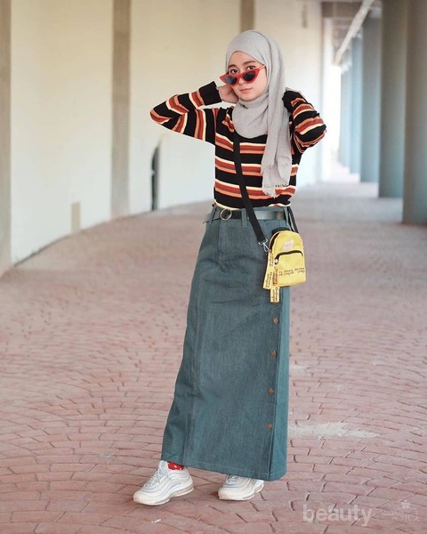 Kamu bisa menambahkan belt hitam di rokmu agar penampilanmu semakin menarik. Meskipun tampilan ini casual, namun terkesan menarik karena permainan warna yang mencolok pada kaosnya. Kamu bisa menambahkan dengan sneakers favoritmu agar penampilanmu terlihat sporty. Pakailah hijab casual, agar tak menambah kesan ramai pada gara berpakaianmu.