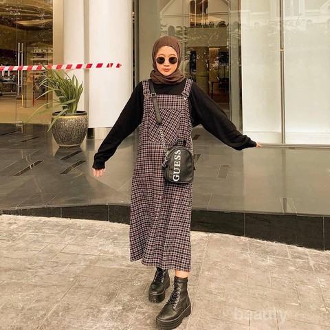 Nah, buat kamu yang ingin nongkrong ke mall, kamu bisa contek gara berpakaian selebgram ini lho ladies!. Wanita yang akrab disapa Aci ini memadu padankan jumpsuit bermotif kotak-kotak dengan kaos oversized berwarna hitam. Tampilannya semakin terlihat menarik dengan sepatu boots dan hijab casual versinya. Kamu bisa contek gaya berpakaian yang simple ini kan ladies!