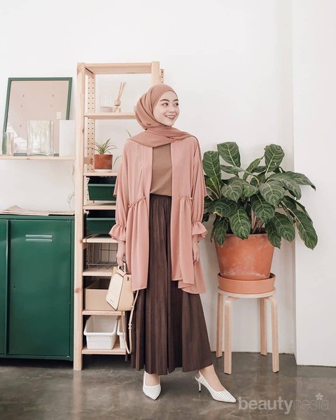 Seperti look yang satu ini, Meirani memadukan rok plisket dengan outer panjang berwarna pink. Buat kamu yang girly banget, kamu bisa contek inspirasi look yang satu ini lho ladies! Jangan lupa memakai heels yang senada dengan bajumu. Agar penampilanmu tak terkesan norak, pakailah hijab casual dengan warna senada.