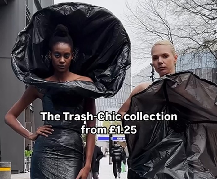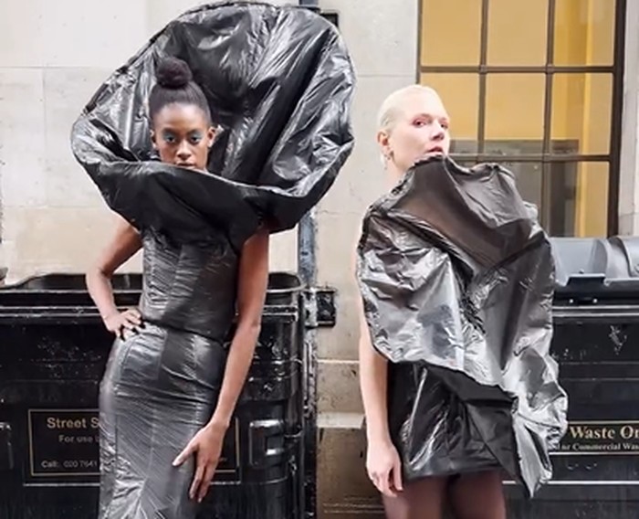 Dua model tampak berjalan di tengah kota dengan percaya diri, mengenakan gaun avant-garde dari kantong sampah yang didesain dramatis. Salah satu model mengenakan dress ketat dengan kerah raksasa yang membingkai wajahnya, sementara model lainnya tampil dengan rok asimetris dan puff sleeves besar dari plastik hitam, memberikan kesan edgy dan eksperimental.