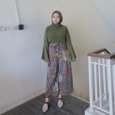 Salah satu brand lokal yang merilis celana kulot batik adalah Gataris. Suka gaya simple, kamu bisa padukan celana kulot batik ini bersama blouse dengan lengan berpotongan modern seperti bell sleeves. Biar matching, kenakan kerudung berwarna senada dengan blouse, misalnya hijau olive. Sempurnakan tampilan dengan memakai flat mules atau flat shoes abu-abu yang minimalis dan juga clutch favorit kamu.