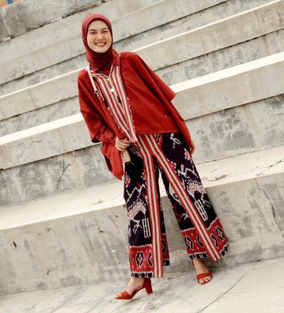 Buat kamu yang berjiwa bebas, coba gaya ala bohemian dengan memakai outfit serba longgar bermotif etnik yang bernuansa merah. Dijamin looks kamu jadi terlihat lebih ceria. Nah, celana kulot batik wajib dicoba, nih. Lalu padukan dengan atasan bersiluet kimono. Set batik yang ini merupakan koleksi dari Rumah Hijab Sabrina.