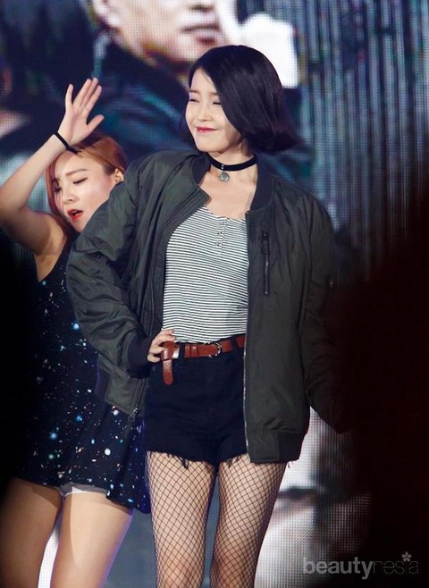 Kali ini, penyanyi asal Korea yang turut mengikuti tren bomber. Dalam penampilannya di acara Infinity Challenge, IU mengenakan bomber yang dipadukan dengan striped shirt, choker, shorts, dan belt berwarna coklat. Tips untuk kamu yang ingin mencoba gaya ini, kamu bisa pilih choker yang memiliki emblem agar tidak terlalu polos.