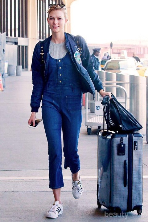 Supermodel asal Amerika, Karlie Kloss, tampil kasual dengan denim overall yang dilapisi dengan jaket bomber berwarna navy. Jika biasanya Ia tampil dengan heels, kali ini sneakers Adidas yang menjadi pelengkap gayanya di bandara. Boleh ditiru nih Ladies, penampilan modis yang tetap comfortable ala Karlie Kloss.