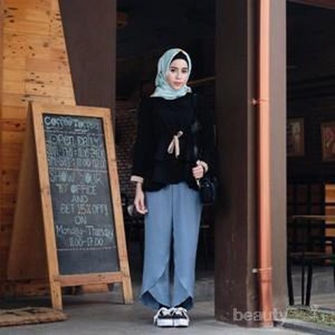 Hitam memang selalu cocok ya dipadukan dengan warna apapun, termasuk juga dengan hijab warna tosca! Warna hitam yang terkesan misterius dipadukan warna tosca yang manis dijamin bakal bikin penampilanmu mysteriously gorgeous! Kamu juga bisa padukan dengan celana berwarna abu-abu atau blue jeans dan juga sepatu warna hitam supaya penampilanmu terlihat balance.