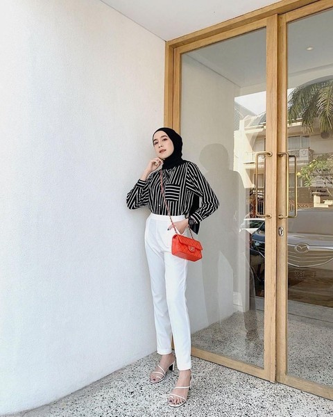 Foto: IstimewaMemakai baju stripe dengan arah yang sama sudah biasa, kamu bisa coba pilih kemeja dengan paduan garis vertikal dan horizontal. Dengan memadukan warna hitam putih dari garis kemeja, kamu bisa memakai celana warna putih. Lalu ditambahkan dengan bling bag warna terang agar terlihat fresh.