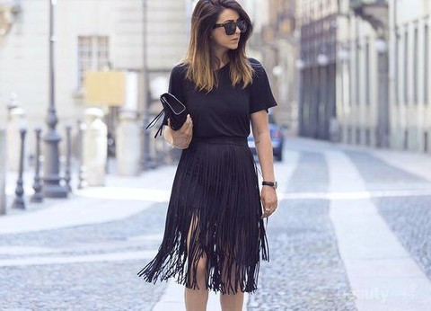 Foto: https://id.pinterest.com/Jika Ladies memiliki rok rumbai, Kamu bisa mulai mix and match dengan blouse warna senada dengan rok rumbai kamu. Mix and match dengan warna senada bisa mengurangi efek tampilan yang terlalu ramai. Selain itu, Ladies juga bisa memadukan outfitmu dengan wedges atau high heels, sehingga tampilan kamu lebih feminin.