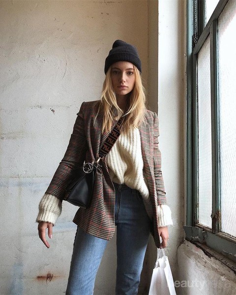 Foto: IstimewaRambut berantakan saat mau pergi ke kantor? Tenang aja, kamu bisa memadukan beanie hat sama cardigan dengan outer blazer yang ada di lemari kamu. Jangan lupa dengan sling bagnya ya!