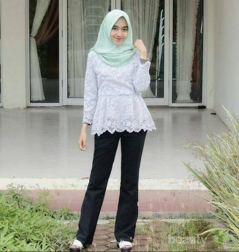 Jika dulu kain brokat hanya diperuntukan untuk model baju formal seperti kebaya, sekarang kain brokat bisa kamu pakai sebagai busana muslim kasual untuk sehari-hari. Seperti inspirasi berikut ini ladies. Kamu bisa memakai baju muslim model peplum brokat yang dipadankan dengan celana bahan warna netral seperti hitam. Tampilan ini bisa kamu pakai untuk hangout ke mall atau untuk kamu yang masih kuliah juga bisa kamu kenakan untuk kuliah lho.