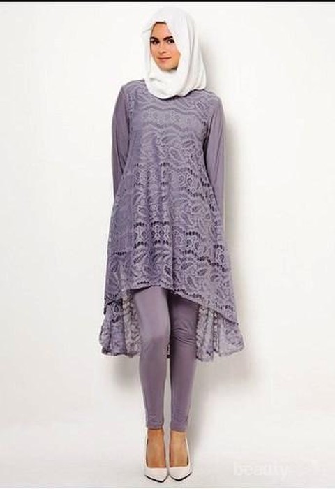 Unik dan simple adalah kesan pertama ketika melihat model baju tunik berikut ini. Uniknya baju muslim berikut ini, bisa dikombinasukan dengan kain satin atau kaos di bagian lengan yang memakai warna senada dengan kain brokatnya. Model sedikit panjang di bagian belakang merupakan aksen agar penampilan kamu semkain terlihat fashionable. Nah untuk bawahannya sendiri bisa kamu padankan dengan leging warna senada atau jeans leging warna biru tua. Jangan lupa untuk kenakan warna hijab yang netral ya ladies.