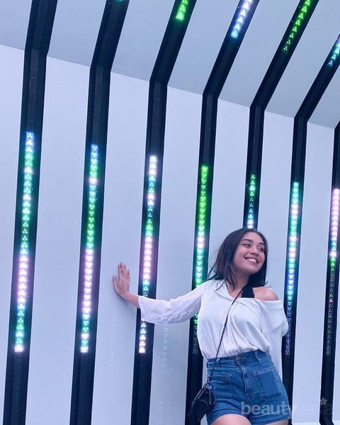 Lula mengenakan outfit berwarna putih dengan aksen off shoulder dipadukan dengan high-waist hot pants denim. Lula juga menggunakan sneakers putih dengan model chunky untuk melengkapi keseruannya di DWP 2019.