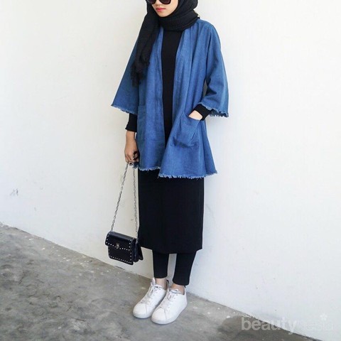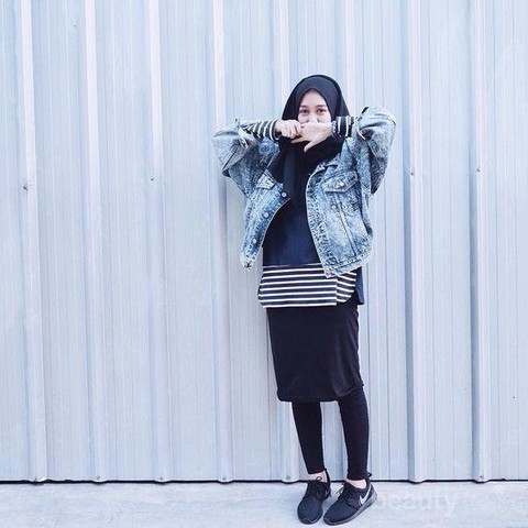 Salah satu selebgram yang populer dengan fahsion style yang kece adalah Strngrrr. Ia mengaplikasikan gaya layer alias tumpuk pada tampilan rok midi hijab miliknya. Intan mengenakan jaket jeans sebagai luaran.