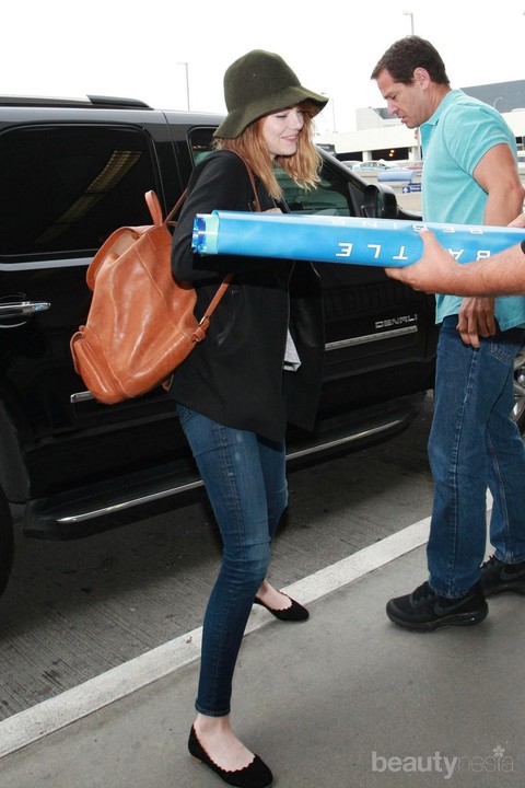 Emma Stone terlihat tampil keren dengan menggunakan tas ransel kulit berwarna coklat. Ia terlihat menggunakan gaya casual smart dengan memadukan blazer hitam dan celana denim. Gaya seperti ini cocok banget untuk kamu gunakan pada berbagai suasana, bahkan ketika kamu beraktivitas sehari-hari, seperti ke kantor atau ke kampus. Untuk sepatu, kamu bisa menggunakan flat shoes seperti Emma Stone atau sneakers untuk kesan yang lebih kasual.