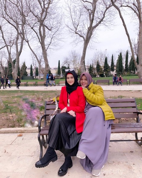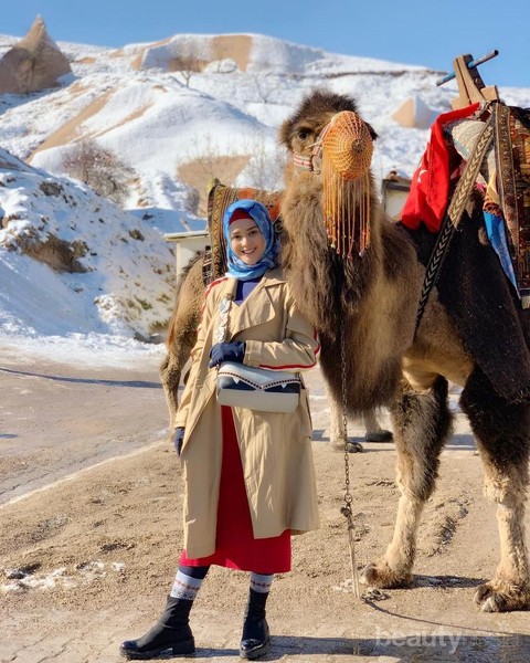 Cantiknya berhijab, Cut Meyriska tampil dengan outfit musim dingin saat berlibur ke Turki. Coat warna beige dipadukan dengan dress merah. Ia memberi sentuhan adem pada hijab biru bermotifnya. Tak lupa, ia juga mengenakan gloves dan sepatu warna hitam.