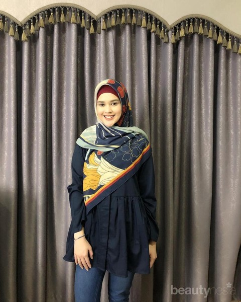 Penampilan sehari-hari yang simpel namun tetap memenuhi syariat Islam ini bisa ditiru. Cut Meyriska dalam berhijab dengan tampil gaya kasual memakai tunik dan celana jins. Warna navy memberi kesan minimalis. Penampilannya dipercantik dengan hijab motif floral.