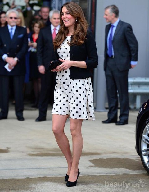 Tiru penampilan anggun ala Kate Middleton dengan memadukan dress polkadot dengan blazer. Perpaduan motif polkadot dengan blazer polos dengan warna senada aman digunakan untuk pemula, blazer bisa disesuaikan dengan outfit mana pun untuk acara formal atau santai.