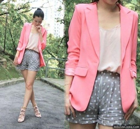 Gunakan shorts untuk membuat kombinasi blazer dan polkadot terlihat lebih santai.