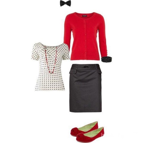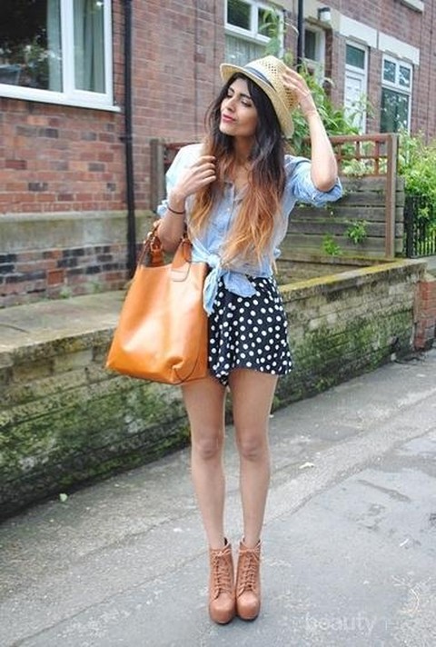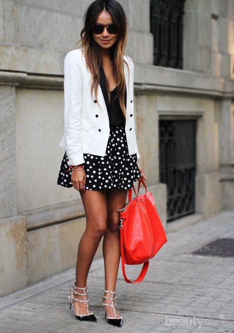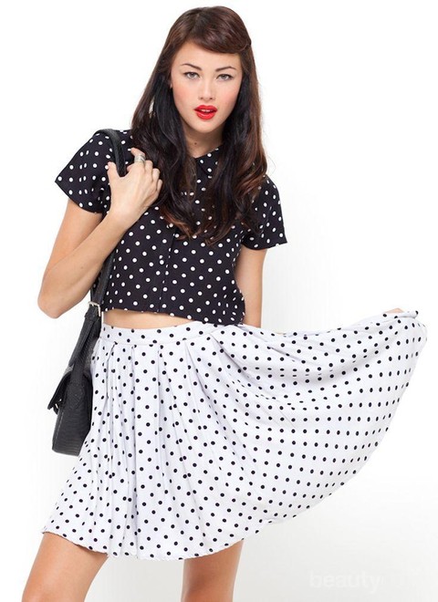 Mau pakai motif polkadot di rok mini atau atasan, dua kombinasi itu tidak akan terlihat aneh. Jika tidak pede dengan bentuk kaki, gunakan thigh high sock.