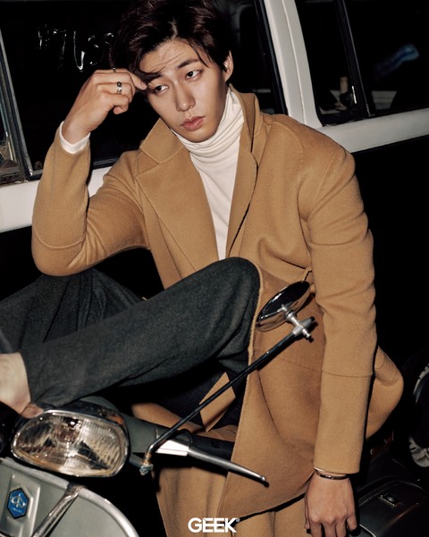 Sedangkan Song Jae Rim mengenakan coat ini dengan dalaman turtleneck putih gading untuk majalah GEEK edisi November. Dia mengkombinasikannya dengan celana abu-abu dan cincin perak sambil berpose di atas motor. Ekspresinya yang ditunjukkannya terlihat lucu. Walaupun begitu, penampilan Song Jae Rim secara keseluruhan terlihat elegan dengan pilihan bajunya.