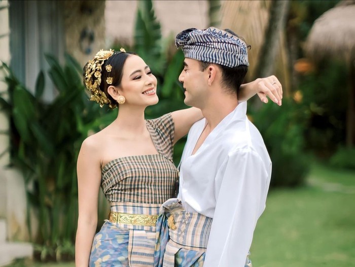 Lewat foto-foto prewedding, pasangan artis Indonesia yang bertemu di sinetron Suami Pengganti (2022-2023) ini menunjukkan kemesraan. Gayanya apik dalam balutan baju adat Bali.