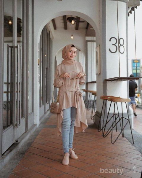 Ingin tampil lebih kasual dan simpel, kamu bisa mengenakan padu padan tunik model ikat dengan warna cokelat muda yang dipadu padankan denga celana jeans. Padu padan tunik satu ini sangat cocok untuk tampilan ke mall atau ke kampus, lho!