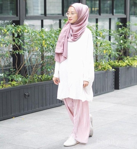 Ini cocok buat kamu yang memiliki tubuh kecil dan selalu kerepotan dalam memilih baju. Ya, padu padan tunik dengan celana kulot plisket ini bisa kamu coba sebagai ootd baju kantoran atau hangout ke mall. Pemilihan warna putih pada tunik dan merah muda pada kulot sangat tepat, karena kedua warna ini tampak matching jika dipadukan menjadi satu kesatuan.