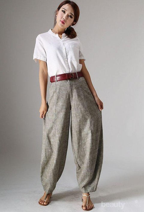 Baggy pants merupakan celana yang lebih lebar di bagian paha, sementara ujung bawahnya mengerucut. Tentunya, celana ini cocok untuk kamu berpaha besar, karena bisa menyembunyikan bentuk pahamu. Celana ini juga bisa menyiasati bagian pinggang kamu dengan hip-nya yang longgar.