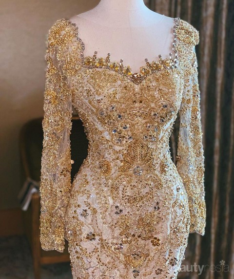 Kebaya cantik ini dihiasi oleh payet dan bordir berwarna silver dan dipadukan dengan kain batik berwarna senada dengan aksen cokelat. Kebaya yang digunakan oleh Rica juga serasi dengan pakaian pengantin Sunda yang digunakan oleh sang Suami. Cantik banget iya, pengantin satu ini!