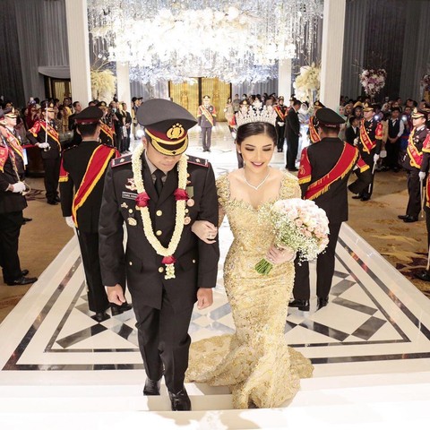 Berbeda dengan acara akad pernikahan yang bertema pengantin tradisional Sunda. Untuk acara resepsi, Rica Andrinani tampil menawan bak ratu semalam dengan gaun cantik dari Asky Febrianti berwarna gold. Gaun pernikahan ini dihiasi oleh manik-manik dan bordir berwarna gold dan silver, Terlihat sangat mewah dan anggun.