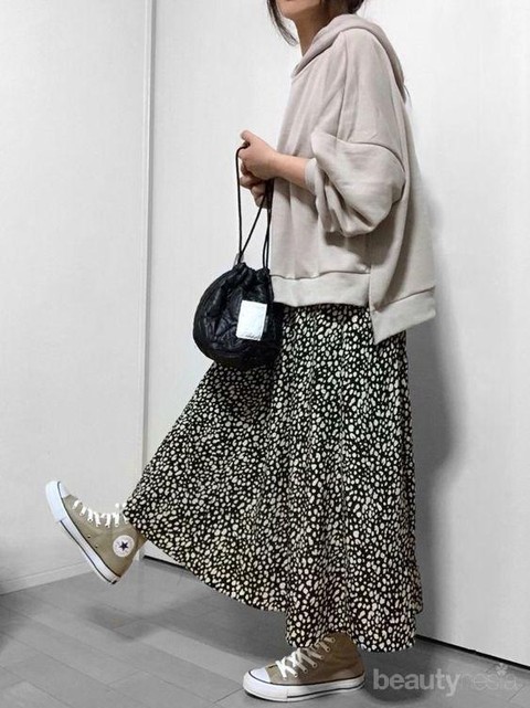Bagaimana jika hoodie dipadukan dengan rok panjang? Hasilnya dijamin akan sangat cantik dan elegan dengan style casual yang manimalis! Cobalah untuk mengenakan hoodie polos dengan rok bermotif yang mempunyai warna senada. Style ini bisa kamu gunakan saat pergi berkunjung ke rumah keluarga atau saat nongkrong di kafe dengan teman-teman.