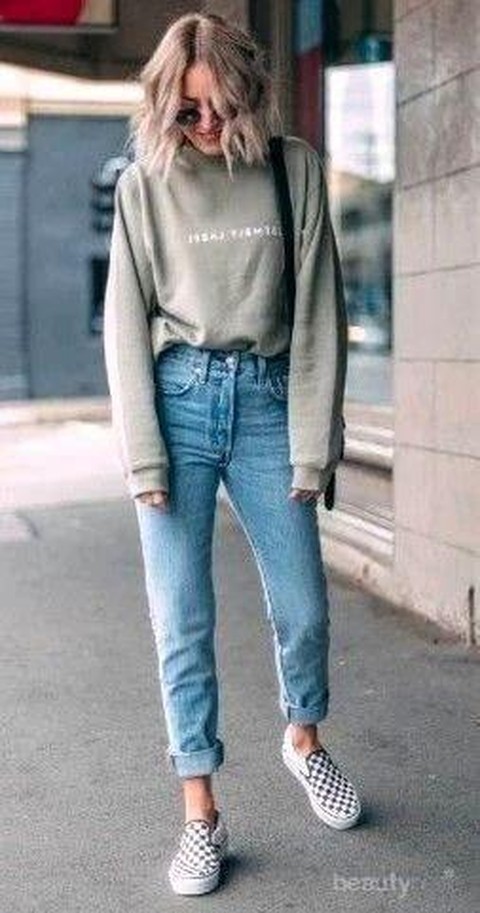 Mom jeans memang sangat populer di tahun 2020 ini. Kamu bisa menggunakannya sebagai kombinasi yang cantik dan keren jika memadukannya dengan hoodie. Outfit ini bisa kamu pakai saat traveling ke tempat yang dingin atau saat hangout ke mall dengan teman-teman. Selain itu, lengkapi style kamu dengan mengenakan tote bag kesayanganmu.