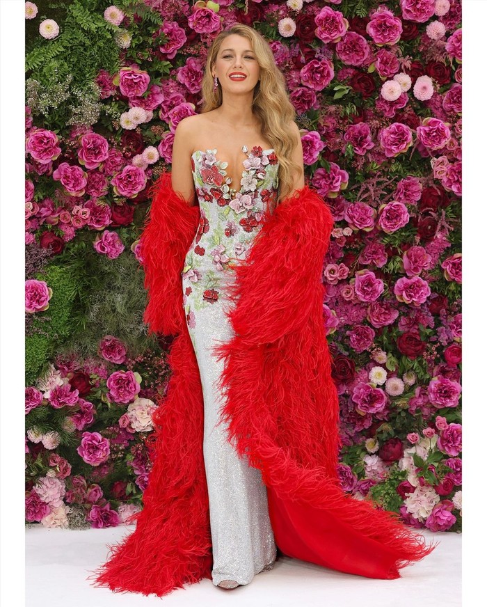 Hadir di pemutaran film terbarunya, artis berusia 36 tahun ini memilih gaun strapless dari koleksi busana musim gugur 2024 Tamara Ralph. Gaun bermotif bunga yang dikenakan Lively menampilkan rangkaian bunga yang menjalar yang terbuat dari manik-manik dan kristal.