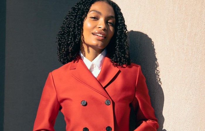 Misalnya setelan jas double-breasted yang dikenakan Yara Shahidi berikut ini. Kemeja putih disandingkan jaket dan rok dalam warna scarlet merepresentasikan warna almamaternya, Universitas Harvard.