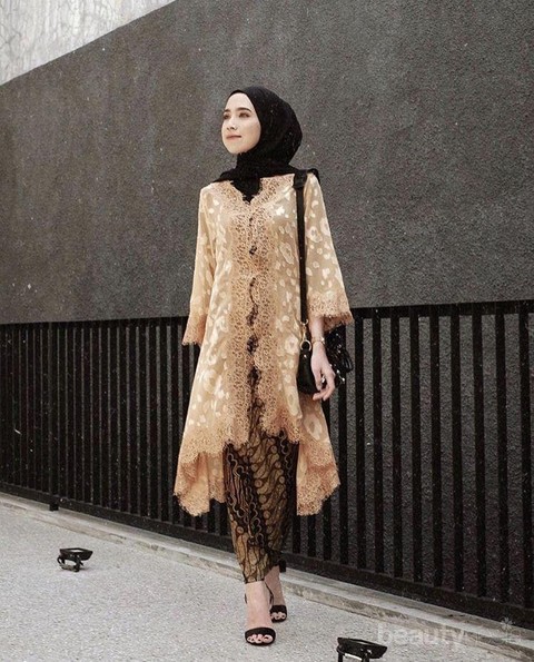 Kebaya modern in cocok banget untuk kamu gunakan ke kantor karena modelnya yang simpel dengan warna yang netral. Meski begitu aksen manik-manik pada bagian pinggang membuat kebaya modern yang kamu gunakan ini terlihat semakin cantik. Padukan juga dengan sepatu heels yang cantik.