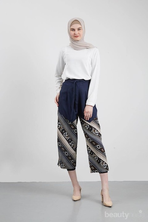 Siapa bilang hijab dan batik tidak dapat dipadukan dengan kece? Salah satu padu padan batik dan hijab yang paling oke adalah dengan menggunakan fashion item pada tampilan kamu dengan aksen batik. Misalnya, celana batik. Kamu bisa menggunakan celana batik yang dipadukan dengan atasan warna basic misalnya cokelat ataupun putih.