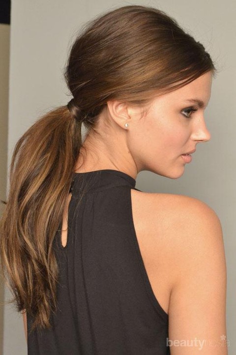 Ikat ekor kuda adalah cara yang paling gampang dilakukan. Rapikan rambut, sisir ke belakang, kuncir pelan-pelan dengan ikat rambut pilihanmu.