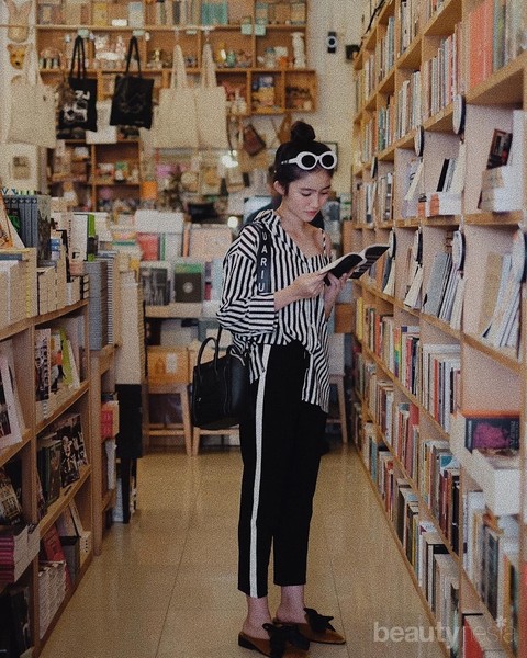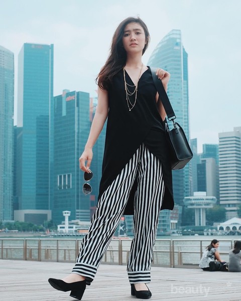Warna monochrome hitam putih memang tidak pernah lepas dari motif garis-garis. Style fashion Febby dengan outfit kemeja stripes dan training pants memang sedang cukup kekinian saat ini. Apalagi dipadukan dengan kaca mata frame putih, black sling bag, dan black sandals. Tampilan ini dijamin nyaman banget dipakai untuk hangout ke mall atau sekadar berjalan-jalan di akhir pekan.