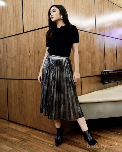 Febby juga pernah terlihat feminine dengan gaya outfit monochrome menggunakan padu padan rok plisket berwarna silver kehitaman dan atasan hitam berbahan brokat. Tampilannya semakin cantik dengan aksesoris berupa anting silver dan sepatu boots hitam. Meskipun sederhana, gaya monochrome Febby yang satu ini banyak yang suka, lho!